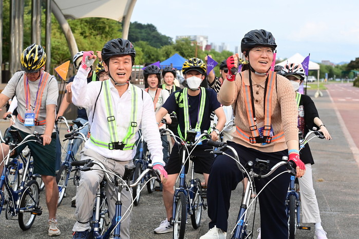 조규일 시장과 장미란 2차관은 최근 뜨거운 반응을 자아내고 있는 진주시 야간관광 콘텐츠‘나이트 자슐랭 투어’현장에서 자전거라이딩을 함께 하면서 진주성 국가유산미디어아트, 진주야행, 글로벌 인플루언스 팸투어, 남강별밤피크닉 등을 소개했다.