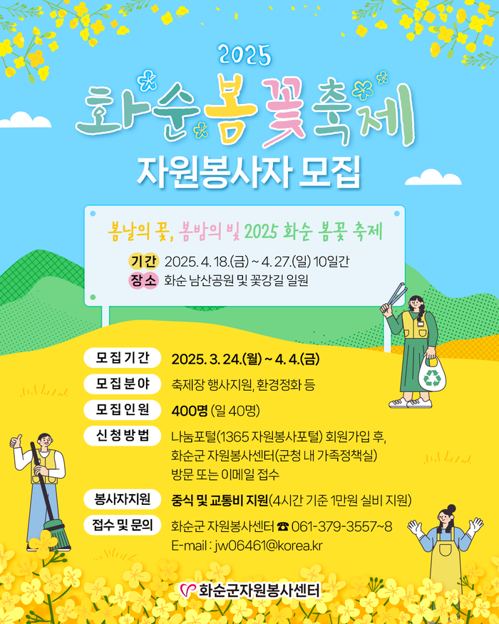 [전남=프레스뉴스] 박정철 기자=화순군(군수 구복규)은『2025 화순 봄꽃 축제』성공적인 운영을 위해 자원봉사자를 3월 24일부터 4월 4일까지 모집한다고 밝혔다.