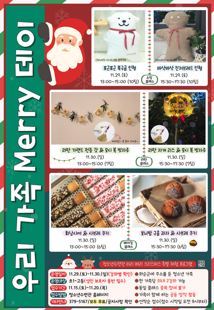 이번 특별 체험 프로그램은 크리스마스를 앞두고 가족이 함께 소통하며 따뜻한 연말 분위기를 미리 느낄 수 있도록 마련된 무료 체험 행사다. 주요 프로그램으로는 ▲포근포근 인형을 만들어보는 소잉 클래스 ▲크리스마스 리스와 가랜드를 제작하는 라탄 클래스, ▲달콤한 향기와 따뜻한 감성을 더하는 베이킹 클래스로 구성되어 있다.