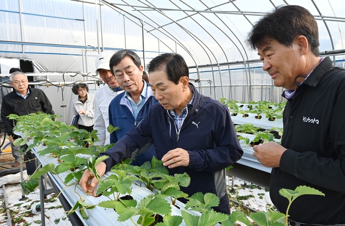 | ▲성낙인 창녕군수가 부곡면 일원의 딸기, 벼 농가 현장을 방문해 영농상황을 살피고 있다.(사진=창녕군) |