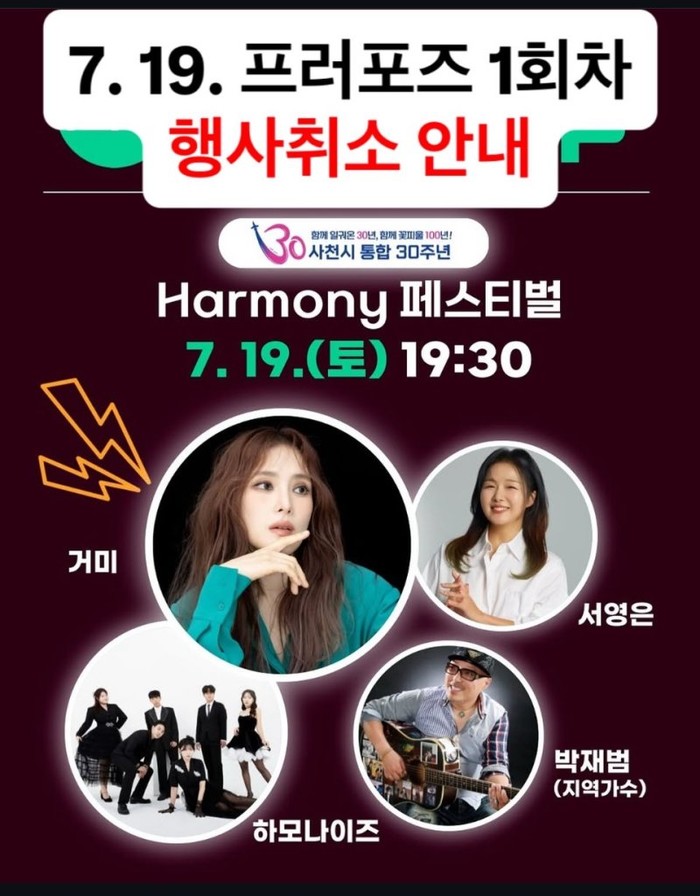 ▲사천시는 7월 19일 삼천포대교 해상무대에서 예정된 ‘2025 토요상설무대 프러포즈’ 1회차 ‘Harmony 페스티벌’ 공연을 전면 취소하기로 결정했다. (사진=사천시) |