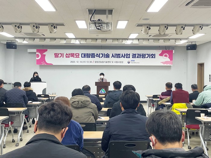 ▲ 함양군에서 딸기 육묘 농가의 경영비 절감과 생산성 향상을 위한 시범사업인 딸기 삽목묘 대량증식기술 시범사업의 성과를 공유하는 평가회가 열렸다.(사진=함양군) |