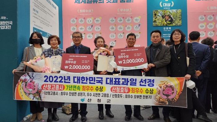 산청군은 지난 2일 대구 엑스코에서 열린 ‘2022 대한민국 대표 과일 선발대회’에서 성현기(71세, 단성면) 씨가 출품한 고종시와 민병기(70세, 오부면) 씨가 출품한 호두가 최우수상인 농림축산식품부 장관상을 수상했다고 밝혔다.