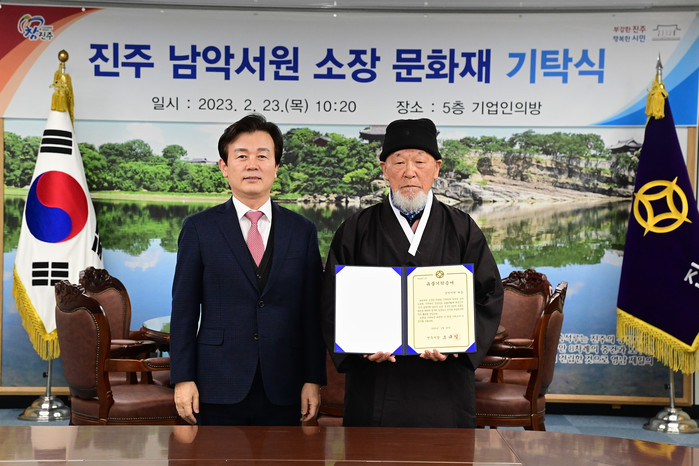 [프레스뉴스] 정재훈 기자= 진주시는 23일 오전 시청 기업인의 방에서 진주 남악서원(원장 최명림)과 소장유물 기탁식을 가졌다.