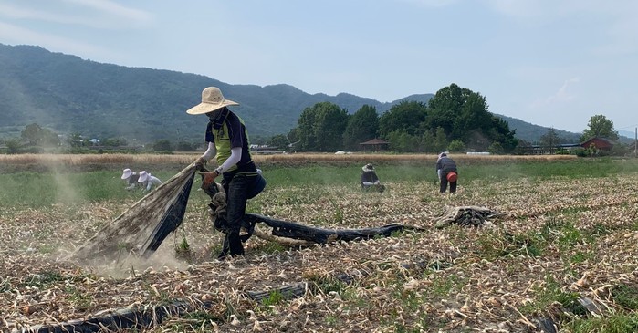 | ▲ 합천군 마늘 농가의 마늘 수확 작업이 한창이다.(사진=합천군) |