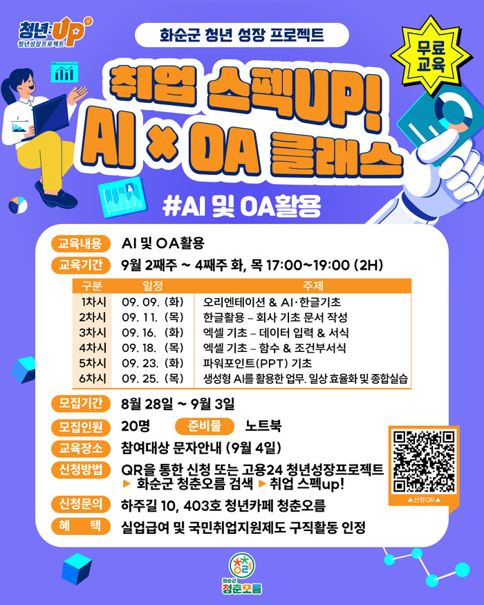 모집인원은 20명이며, 화순군에 거주하는 만 15세~ 49세 청년이라면 누구나 무료로 참여할 수 있다. 모집 기간은 8월 28일부터 9월 3일까지 이며, QR 또는 고용24를 통해 선착순으로 모집한다.