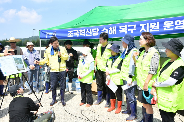 이날 현장에는 조국혁신당 김선민 당대표 권한대행, 서왕진 원내대표 및 당원 100여 명이 함께 수해 복구 자원봉사에 참여하며 피해 농가 일손 돕기와 시설물 정비 작업 등을 진행했다.