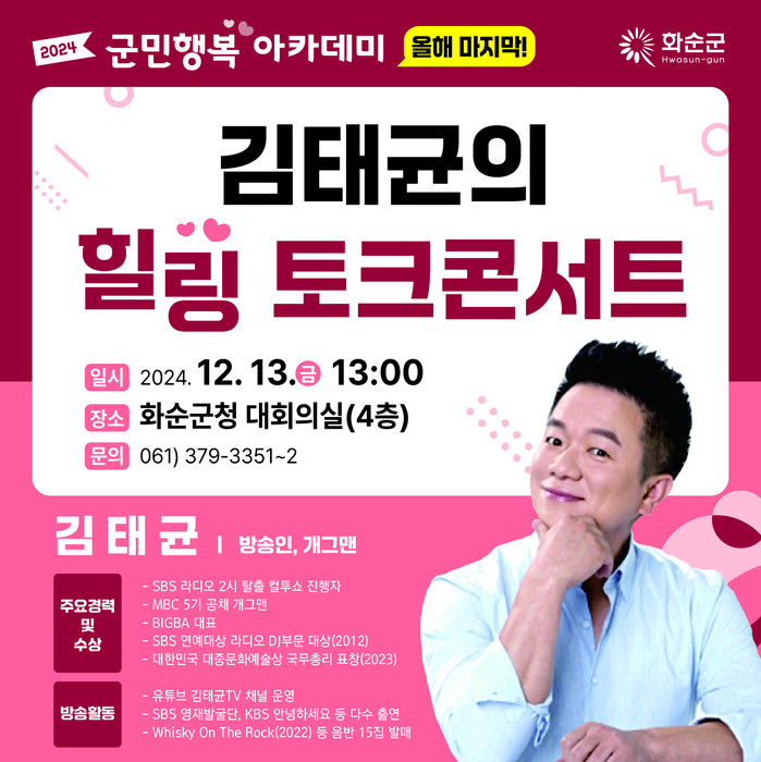 조미화 인구청년정책과장은 “연말에 재미와 감동을 동시에 줄 수 있는 강연을 준비한 만큼 많은 군민이 함께 하길 바란다.”라고 전했다.