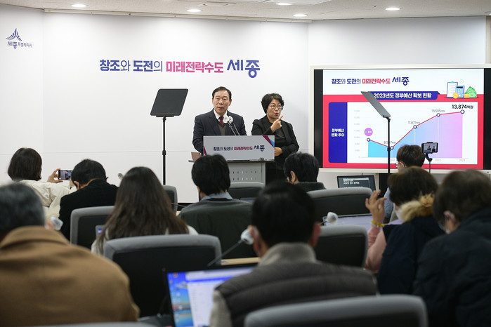 ▲최민호 세종시장은 26일 정음실에서 브리핑을 통해 “시는 정부안 대비 488억원이 증액된 1조 3874억을 확보했다”고 말했다.(사진=세종시) |