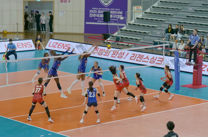 | ▲2025 코리아 인비테이셔널 진주국제여자배구대회가 12일 오후 1시 진주실내체육관에서 일본과 프랑스의 맞대결로 화려한 서막을 열었다. (사진=진주시) |