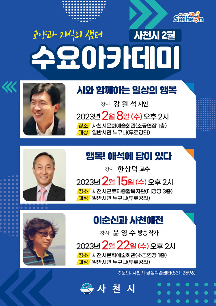 이번 수요아카데미는 2월 8일(1회), 2월 15일(2회), 2월 22일(3회) 등 총 3회에 걸쳐 오후 2시 사천시문화예술회관과 사천시근로자종합복지관에서 각각 개최한다. 1회와 3회는 사천시문화예술회관, 2회는 사천시근로자종합복지관이다.