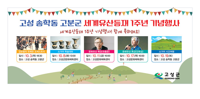 고성군(군수 이상근)은 “고성 송학동 고분군 세계유산 등재 1주년을 기념하는 이번 행사가 지역사회의 자부심을 높이고 고성지역의 고대사와 문화유산을 재조명하는 기회가 될 것으로 기대한다”며 군민 여러분의 많은 관심과 참여를 부탁했다.