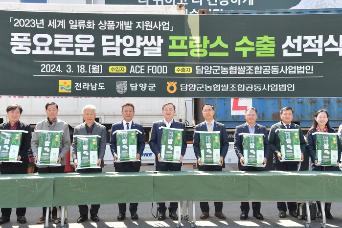 담양군(군수 이병노)은 ‘담양군농협쌀조합공동사업법인’이 프랑스 현지 아시안 식료품 유통전문업체인 ‘ACE FOOD SAS’와 계약해 수출 전용 브랜드인 풍요로운 담양쌀 12톤을 지난 18일 선적했다고 밝혔다.