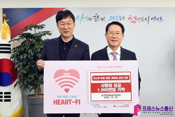 [프레스뉴스] 김대일 기자= 안산시(시장 이민근)는 30일 경기문화예술진흥재단(이사장 민용기)으로부터 지역 문화·예술 꿈나무 지원을 위한 후원금 1천만 원을 기탁받았다.