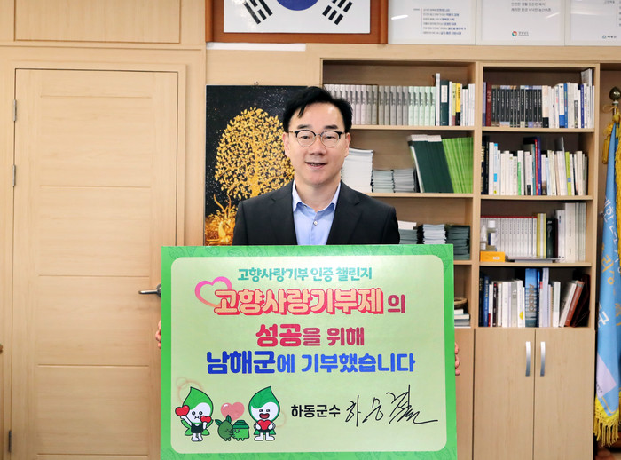 | ▲ 하승철 군수가 23일 고향사랑기부 인증 챌린지에 동참했다.(사진=하동군) |