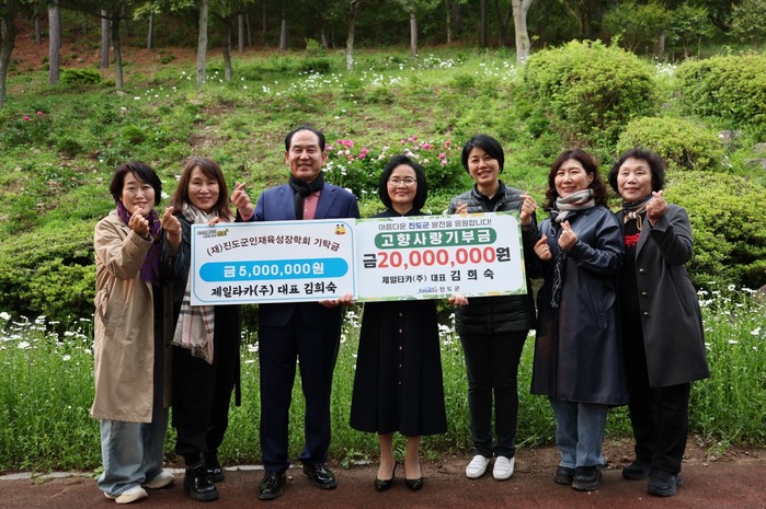 [진도=프레스뉴스] 신상균 기자= 진도군은 (주)제일타카 김희숙 대표가 고향사랑기부제 연간 최고액인 2,000만 원을 기부함과 동시에 진도군 인재육성장학금 500만 원을 기부하며, 진도군에 깊은 애정을 드러냈다고 밝혔다.