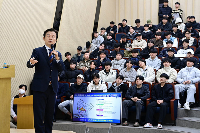 제1의 진주 기적인 ‘진주대첩’과 새로운 시대정신으로 주목받고 있는 제2의 진주 기적인 ‘진주 K-기업가정신’을 설명하고, 학생들에게 진주의 혁신성장 전략사업으로 미래항공기체(AAV)산업과 우주산업, 청년창업 인프라 구축사업에 대해 상세히 소개했다.