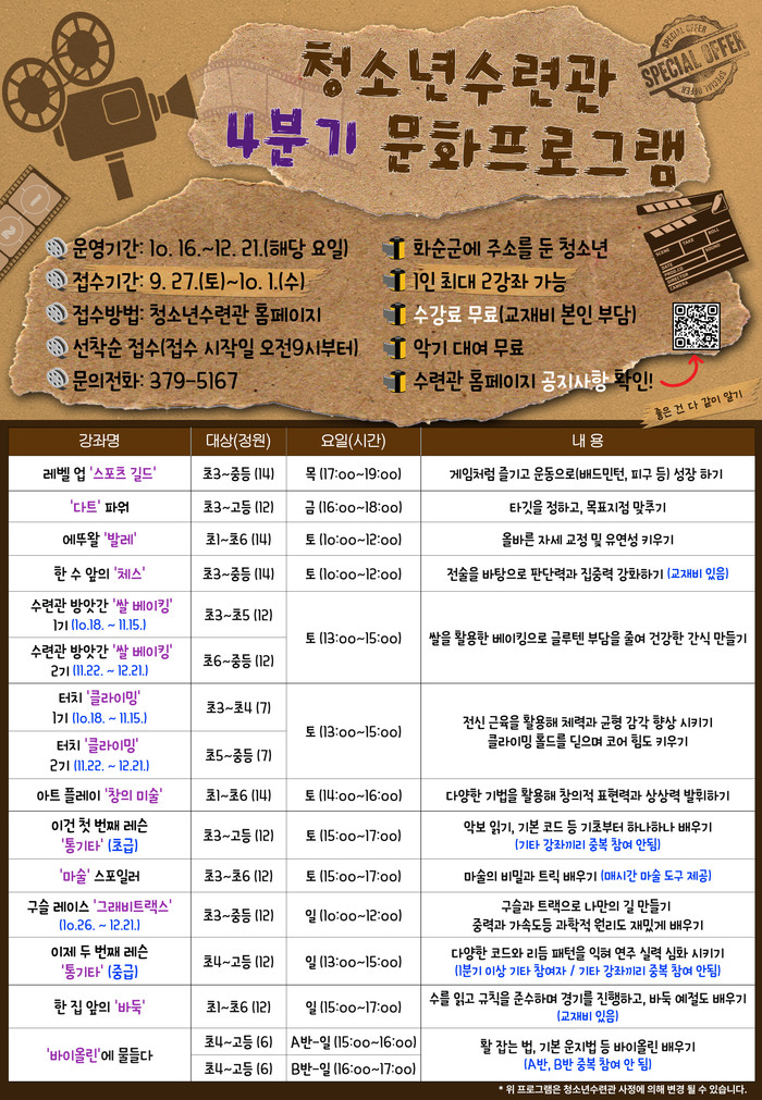 운영 프로그램은 ▲레벨 업 ‘스포츠’ ▲‘다트’ 파워 ▲에뚜왈 ‘발레’ ▲한 수 앞의 ‘체스’ ▲수련관 방앗간 ‘쌀 베이킹’ ▲터치 ‘클라이밍’ ▲아트 플레이 ‘창의 미술’ ▲‘통기타’ 초급 ▲‘마술’ 스포일러 ▲구슬 레이스 ‘그래비트랙스’ ▲‘통기타’ 중급 ▲한 집 앞의 ‘바둑’ ▲‘바이올린’에 물들다 등 총 13개 프로그램으로 청소년들의 눈높이에 맞춘 실습형 중심 수업으로 진행될 예정이다.