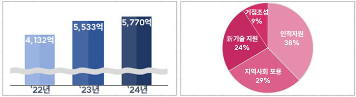 ▲연도별 예산 추이(왼쪽) 및 2024년도 분야별 투자 규모. |