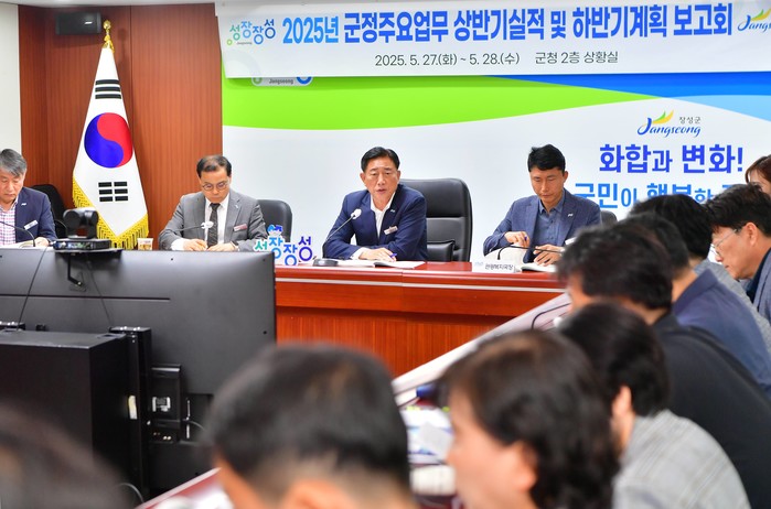 ▲장성군 군정 상반기 실적 및 하반기 계획 보고회를 주관하고 있는 김한종 군수(사진제공=장성군) |
