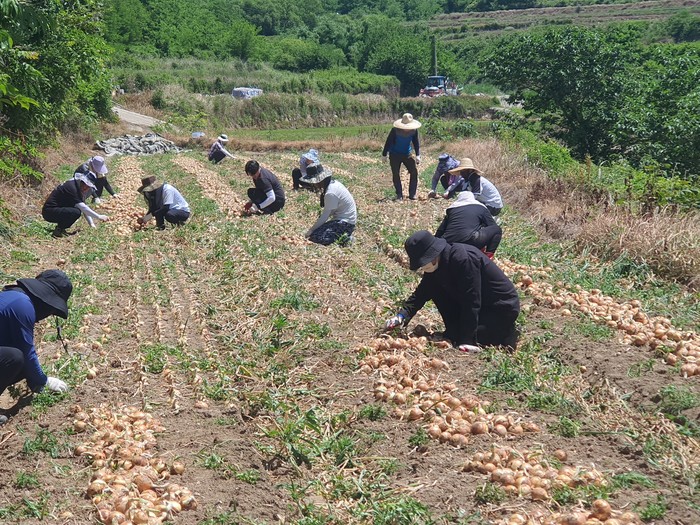 이날 현장에는 기획예산담당관실 소속 직원 20여 명이 참여해, 질병으로 수확 작업이 어려운 농가를 지원하며 양파 수확에 힘을 보탰다.