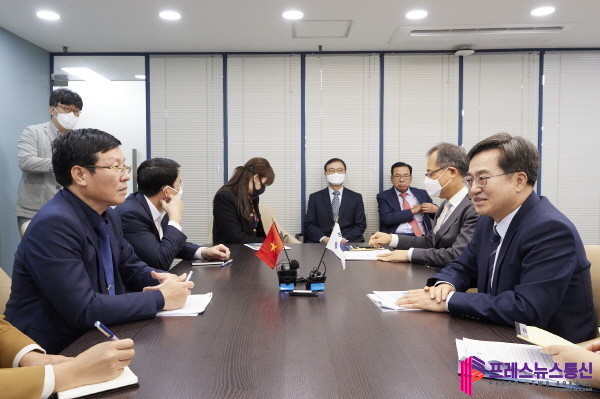 | ▲ 28일 김동연 경기도지사가 서울 영등포구 경기도중앙협력본부 접견실에서 레 쥬이 탄(Le Duy Thanh) 베트남 빈푹성 인민위원장을 접견하고 환담을 하고 있다.(사진=경기도) |
