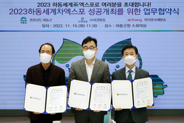 [프레스뉴스] 정재훈 기자= 하동군은 지난 15일 군청 소회의실에서 ㈜서경방송(대표이사 윤철지), 아리랑국제방송(사장 주동원)과 함께 2023하동세계차엑스포 성공 개최 위한 업무협약을 체결했다.