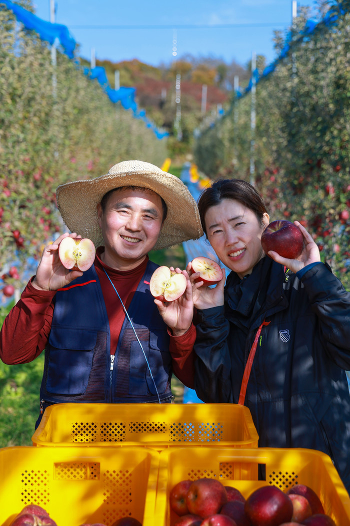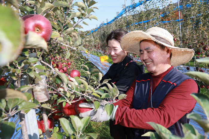 | ▲6일 산청군 차황면 대경농원에서 원강민-노남희 부부가 속이 빨간 엔부사과를 수확하고 있다. (사진=산청군) |