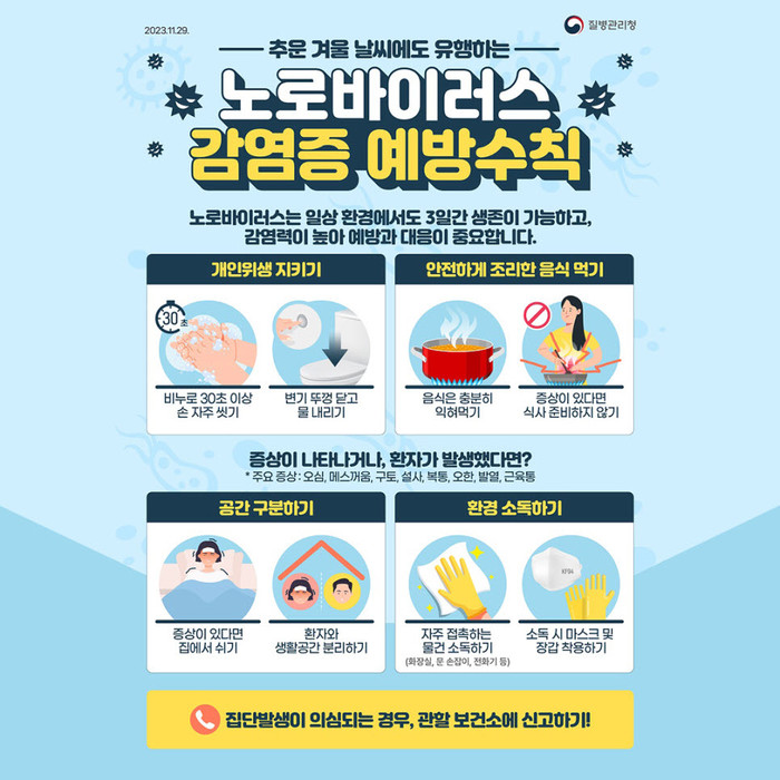 노로바이러스는 일반 세균과 달리 낮은 온도에서 활동이 활발해지는 특성이 있어 추운 날씨로 인해 손 씻기 등 개인 위생관리가 소홀해지는 겨울철에 감염이 급증한다.