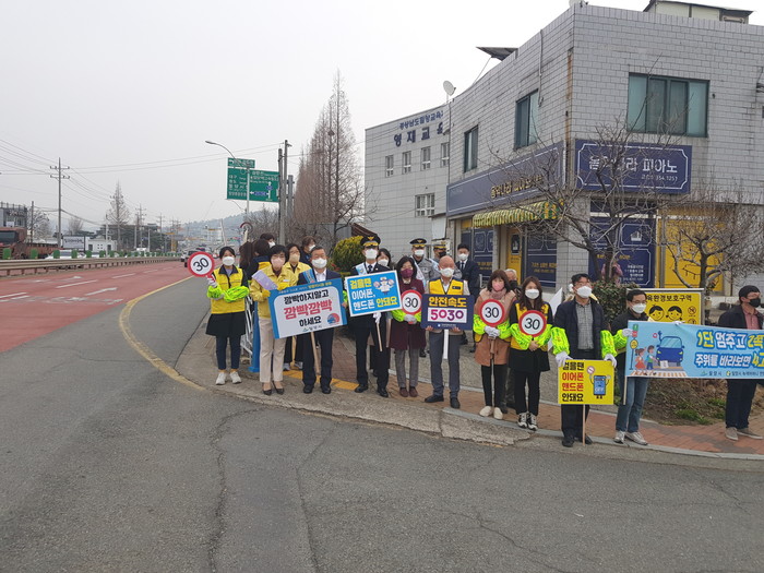 ▲ 지난해 3월 박일호 밀양시장과 밀양경찰서, 밀양교육지원청, 녹색어머니회, 모범운전자회 회원들이상남면 예림초등학교 앞에서 어린이보호구역 내 규정속도 준수, 주정차 금지 등 교통안전 캠페인을 펼치고 있다.(사진=밀양시) |