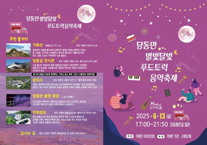 [프레스뉴스] 정재학 기자=경남 고성군 거류면은 오는 6월 13일 ‘당동만 별빛달빛 푸드트럭 음악축제’를 당동해안길 일원에서 개최한다고 밝혔다.