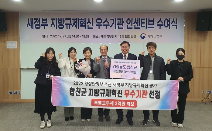 무엇보다 새정부 규제혁신 우수기관 수상은 전국 광역·기초 243개 지자체를 대상으로 중앙규제 및 그림자·행태규제 발굴실적, 규제혁신 확산 및 성과 등을 종합적으로 평가한 결과여서 그간 합천군의 적극적인 규제혁신 노력이 결실을 맺은 것이라 할 수 있다.