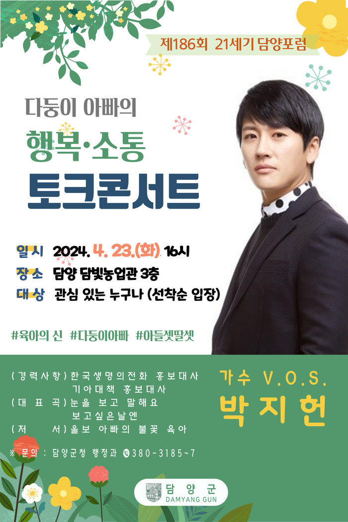 6남매를 키우며 겪은 생생한 경험담과 육아 노하우, 양육의 보람과 기쁨 등에 관한 이야기를 나누며, V.O.S의 대표곡을 들을 수 있는 힐링의 시간도 함께 진행돼 육아와 일상에 지친 군민들에게 소통과 공감을 끌어낼 것으로 기대된다.