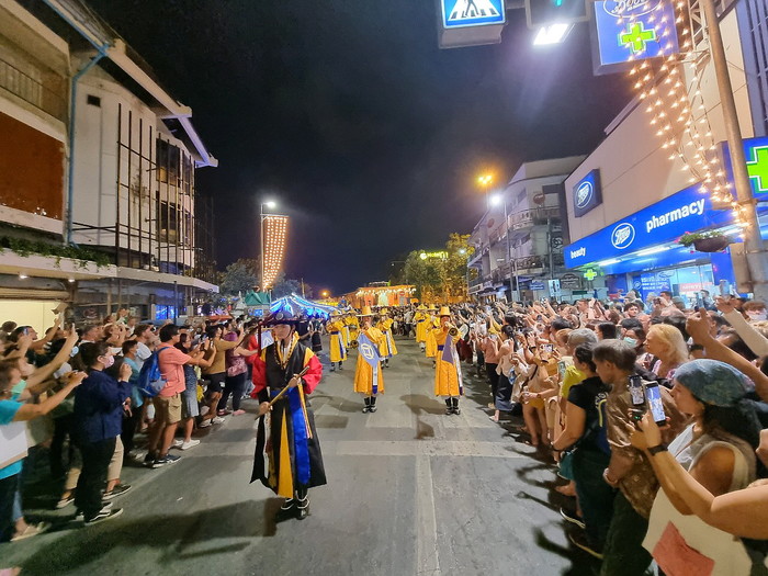 ▲ 진주시 해외교류단, 태국 축제무대에 화려하게 데뷔!-취타대를 필두로 한국 전통의상을 입은 진주시 미술협회 회원과 예총 회원 등이 청사초롱 등을 들고 러이끄라통 가장행렬에 참여했다.(사진=진주시) |