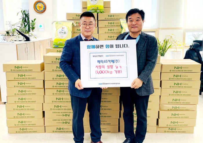 ▲메타45카페(주) (대표 조동우)가 개소식을 기념하여 취약 계층을 위한 쌀을 기부해 전달식이 진행됐다.(사진=협의회) |