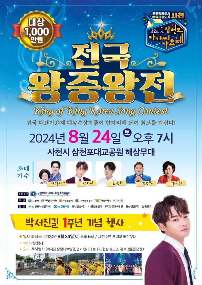 이번 가요제는 ‘왕중왕전’으로 지난 7월 27일 사천시문화예술회관에서 열린 예선에서 선발된 사천대표와 전국 대표 TOP7 등 모두 8명이 열띤 노래경연을 펼친다.