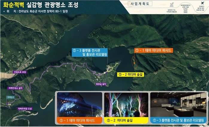 2024년부터 본격 추진되는 1단계 사업 “화순적벽 실감형 관광명소 조성”은 2024년부터 2027년까지 4년간, 총사업비 143억 원을 투자해 화순적벽 자연환경을 활용한 테마 미디어파사드, 홍보관 리모델링, 미디어 경관 및 숲길을 조성하는 사업이다.