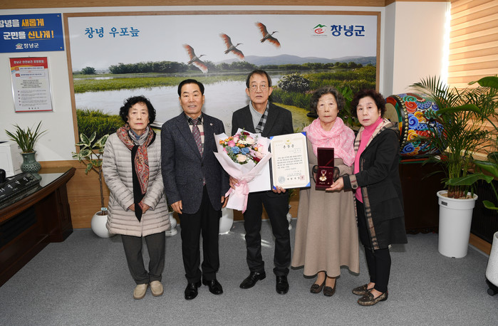 | ▲창녕군(군수 성낙인)은 지난 3일 군수실에서 6.25전쟁에 참전해 공을 세운 고(故) 심의섭 일병의 유족에게 국방부장관을 대신해 화랑무공훈장을 전달하는 전수식을 개최했다. (사진=창녕군) |