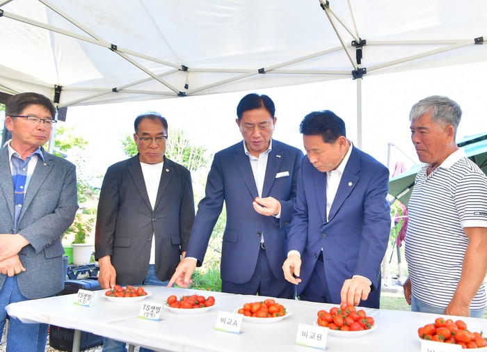 ▲김한종 장성군수(중앙)가 신품종 방울토마토 TS샛별을 시식하고 있다.(사진제공=장성군) |