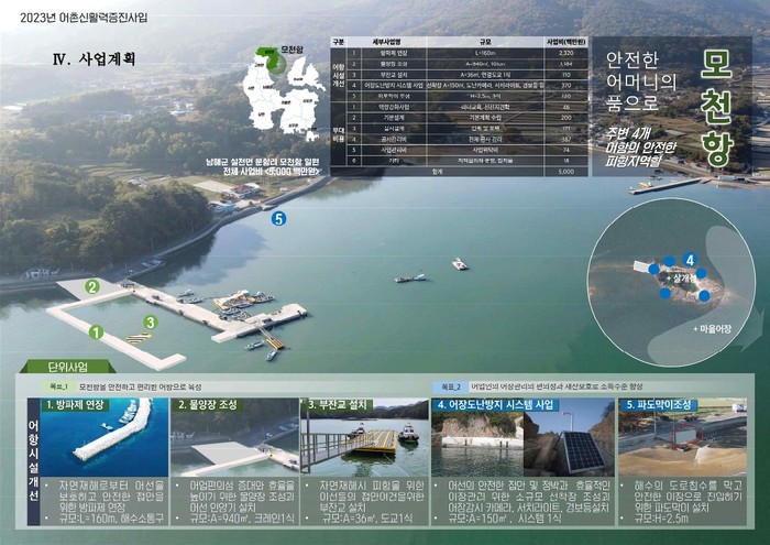 설천면 모천항은 ‘어촌 안전인프라 개선 분야’에 선정됐다. 사업비 50억 원을 투입해 2023년부터 2025년까지 3년간 방파제 연장, 물량장 조성, 부잔교 설치, 어장도난방지 시스템, 파도막이 등을 조성할 계획이다.