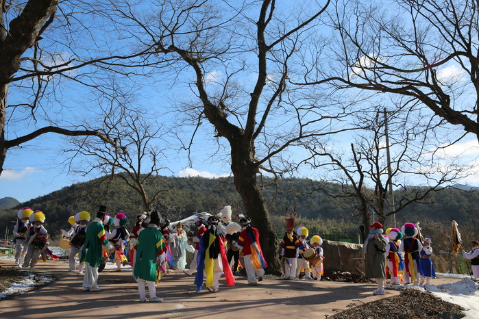 이날 공연은 마을 앞 당산 숲에서 펼쳐지는 당산굿인 들당산을 시작으로 철룡굿 ⇒ 마을샘굿 ⇒ 찬시암굿, 동천시암굿, 버버리시암굿, 온뜰시암굿 ⇒ 마당밟이 ⇒ 판굿 ⇒ 날당산 순으로 진행됐다.