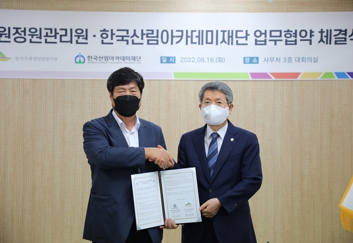 ▲ 산림청 산하 한국수목원 정원관리원이 16일 한국산림아카데미재단과 업무협약을 체결했다.(사진=한수정 제공) |