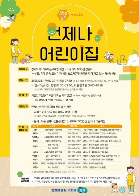 도는 지난해 6월 1일 ▲부천시(아람 어린이집) ▲남양주시(시립힐즈파크 어린이집) ▲김포시(시립금빛하늘 어린이집) ▲하남시(시립행복모아 어린이집) ▲이천시(이천시 24시간 아이돌봄센터 ‘아이다봄’) 5개 시군 5곳에 언제나 어린이집 운영을 시작했다.