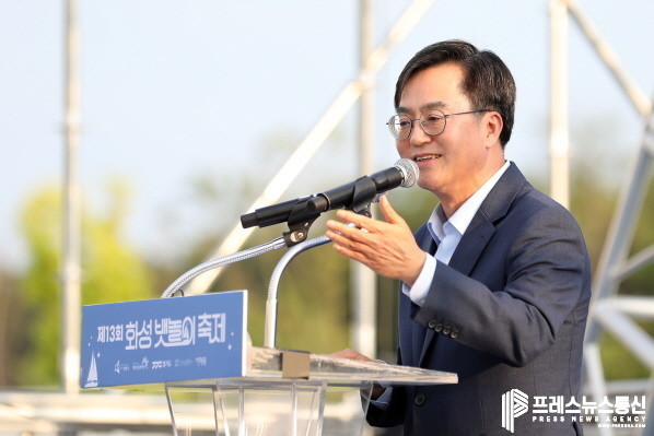 ▲ 9일 오후 화성시 전곡항 일대에서 열린 화성 뱃놀이 축제에서 김동연 경기도지사가 축사를 하고 있다. (사진=경기도) |