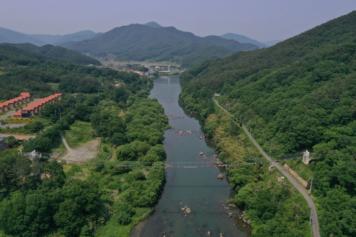 대황강을 가로질러 설치된 모험시설을 체험하다 보면 다리 아래로 눈부신 햇살을 머금고 흐르는 강물과 멀리 보이는 산속 강변의 여유가 넘치는 풍경에 잠시나마 복잡한 일상에서 벗어나는 해방감을 만끽할 수 있다.
