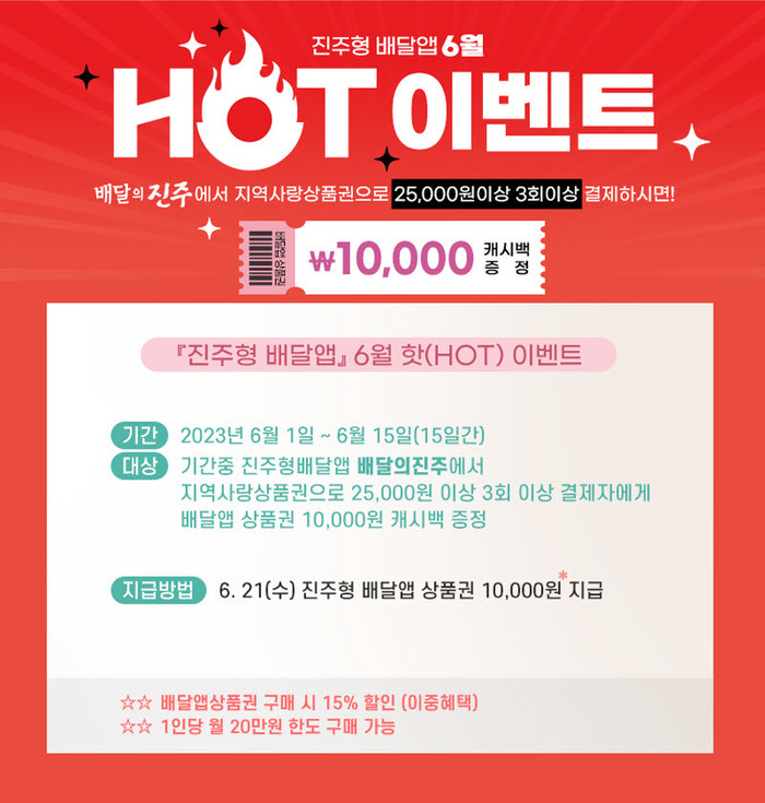 [프레스뉴스] 정재훈 기자= 진주시는 오는 6월 1일부터 15일까지 지역사랑상품권으로 2만 5000원 이상 3회 이상 결제자에게 진주형 배달앱 상품권 캐시백 1만 원을 증정하는 이벤트를 진행한다.