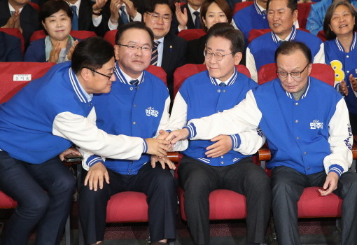 | ▲이재명 더불어민주당 대표와 이해찬·김부겸 상임공동선거대책위원장, 홍익표 원내대표가 10일 오후 서울 여의도 국회 의원회관에 마련된 제22대 국회의원선거(총선) 민주당 개표 상황실에서 방송사 출구조사 결과를 지켜본 후 손을 잡고 있다.(사진= 뉴스1) |