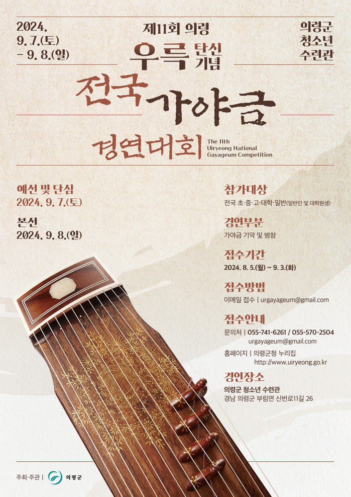 의령군이 주최하고 문화체육관광부가 후원하는 제11회 의령 우륵 탄신기념 전국가야금경연대회가 오는 9월 7일부터 8일까지 이틀간 의령군 부림면 의령군청소년수련관에서 개최된다.