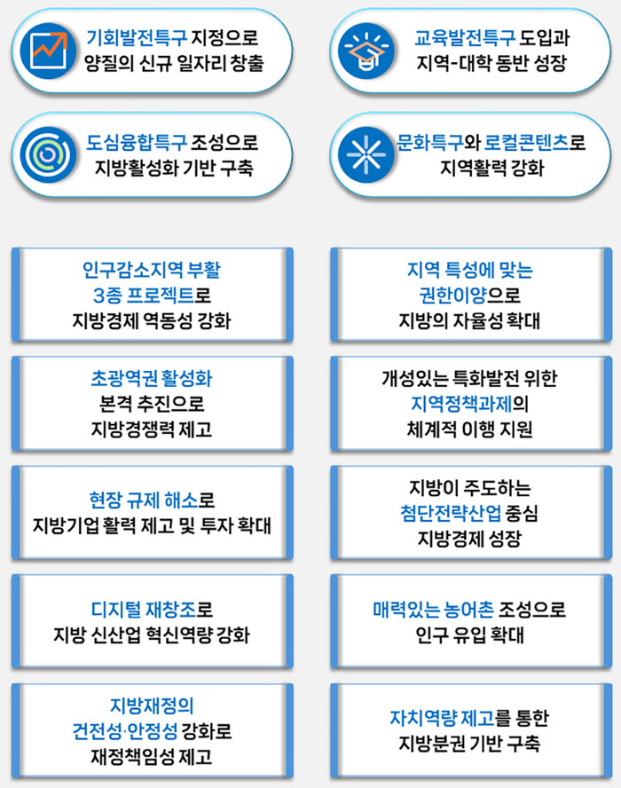 이에 첨단산업·지방투자의 핵심 거점을 마련하며 기회발전 특구 지정을 개시하고, 교육발전특구 시범사업 도입으로 지역주도 교육혁신을 본격 추진한다. 또한 지방도심 복합개발로 인재·기업이 모이는 도심융합특구 선도사업을 본격화하고 인구감소지역 생활인구 확대는 물론 초광역권 활성화로 활력있는 민생경제를 구현한다.