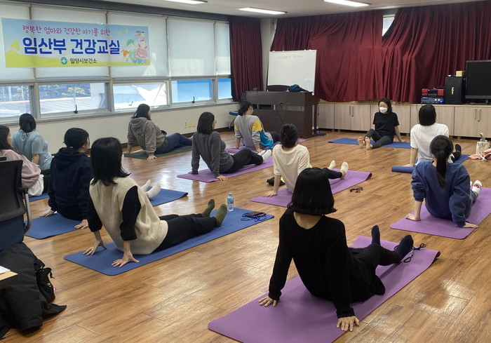 | ▲ 밀양시 임산부들이 ‘임산부 건강교실’의 요가 프로그램에 참여하고 있다.(사진=밀양시) |